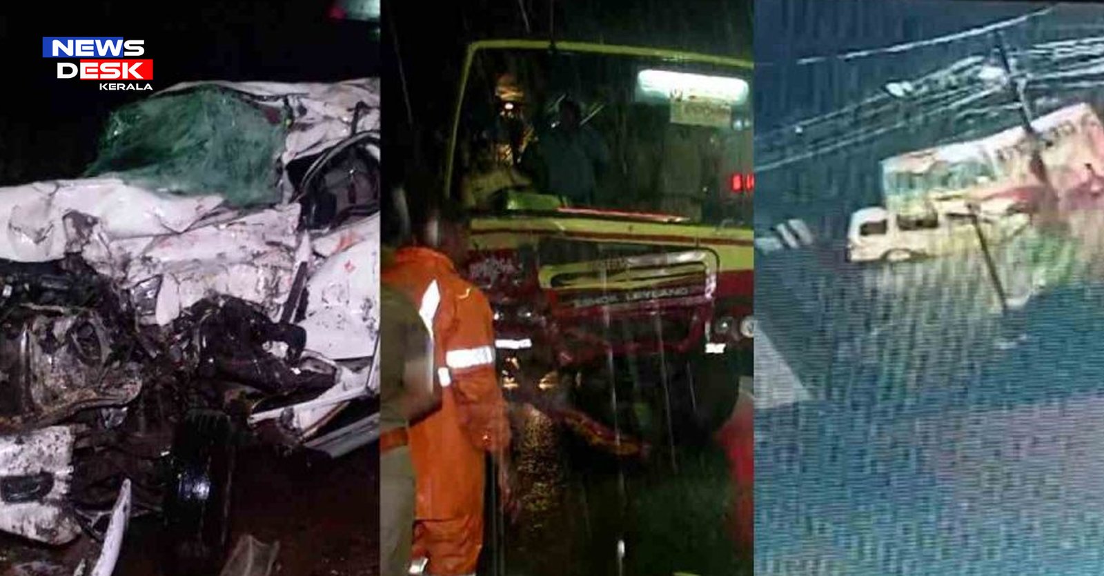 കാര് റോഡിലെ വെള്ളക്കെട്ടില് തെന്നി നിയന്ത്രണം വിട്ട് ബസുമായി കൂട്ടിയിടിക്കുകയായിരുന്നുവെന്ന് ദൃക്സാക്ഷികള് പറയുന്നു.