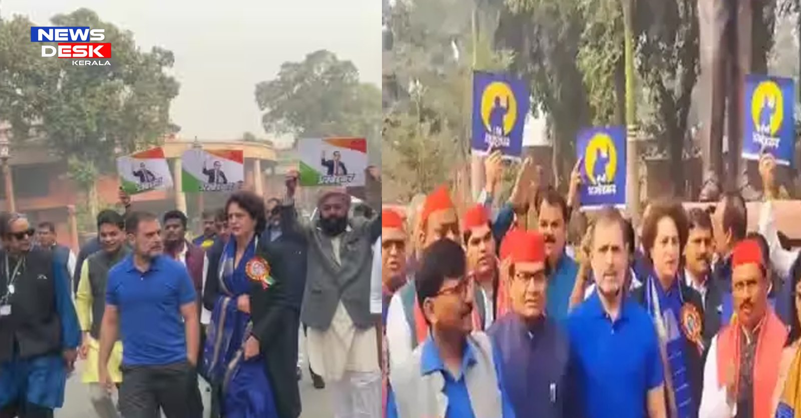 എന്ഡിഎ- ഇന്ത്യ സഖ്യ എംപിമാര് നേര്ക്കുനേര് നിന്ന് മുദ്രാവാക്യം മുഴക്കി. പ്രിയങ്ക ഗാന്ധിയുടെ നേതൃത്വത്തില് കോണ്ഗ്രസ് എംപിമാര് ബിജെപി പ്രതിഷേധത്തിനിടയിലേക്ക് കയറിയതോടെ സംഘര്ഷാവസ്ഥയിലേക്ക് സ്ഥിതിയെത്തി.നീല നിറത്തിലുള്ള വസ്ത്രങ്ങള് അണിഞ്ഞാണ് പ്രതിഷേധം.