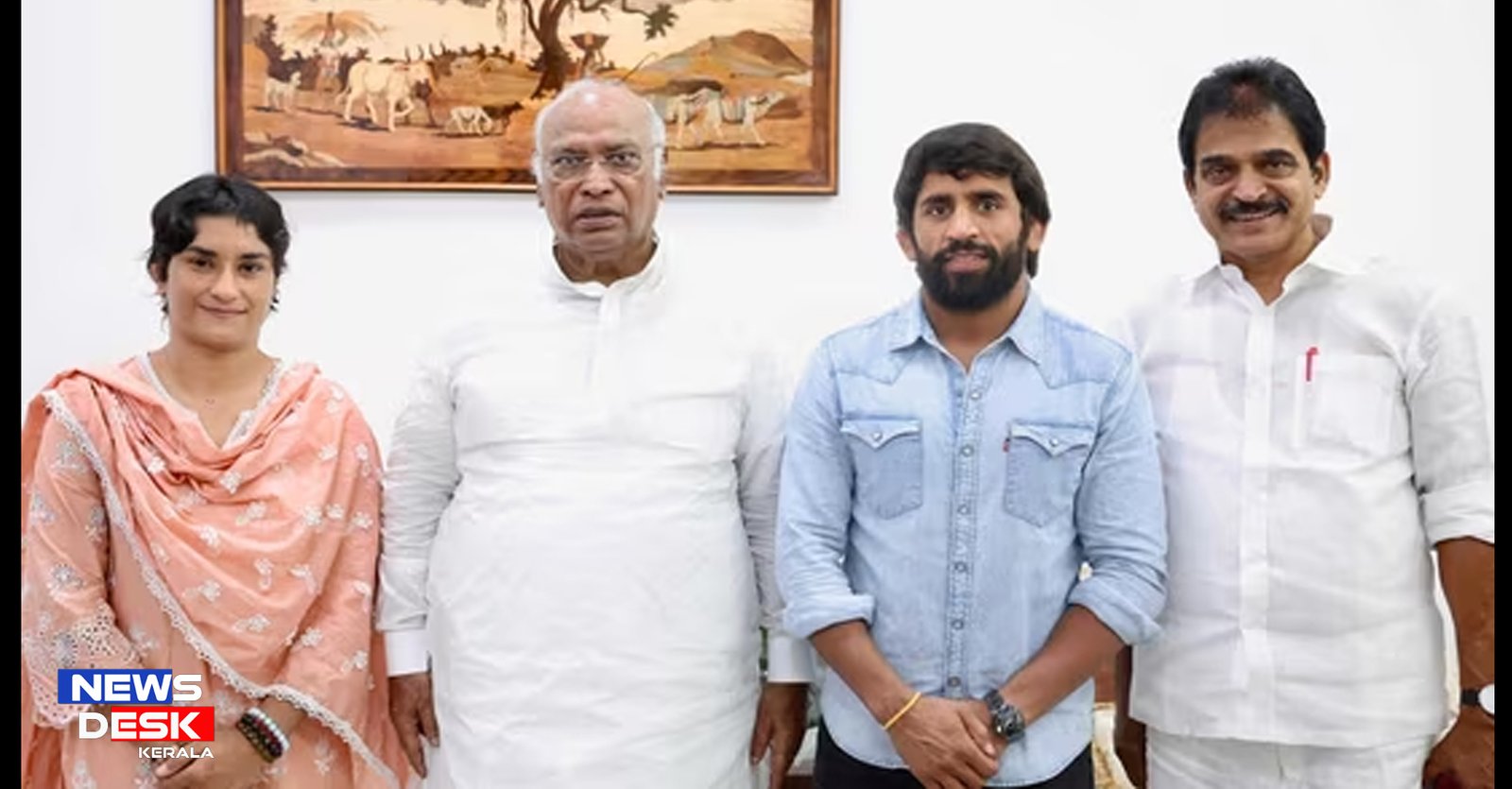 സെപ്റ്റംബര് 4 ന് ന്യൂഡല്ഹിയില് കോണ്ഗ്രസ് നേതാവ് രാഹുല് ഗാന്ധിയുമായി ഗുസ്തി താരങ്ങളായ വിനേഷ് ഫോഗട്ടും ബജ്രംഗ് പുനിയയും കൂടിക്കാഴ്ച നടത്തിയിരുന്നു. ഇവിടെ ഖാര്ഗെയുമായും കെ.സി. വേണുഗോപാലുമായും കൂടിക്കാഴ്ച നടത്തിയ ശേഷമാണ് വിനേഷും ബജ്രംഗും എഐസിസി ആസ്ഥാനത്ത് എത്തിയത്.